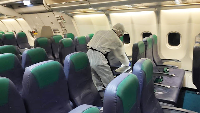 | Cebu Pacific personnel disinfect all surfaces inside the aircraft, including passenger seats and tray tables. |